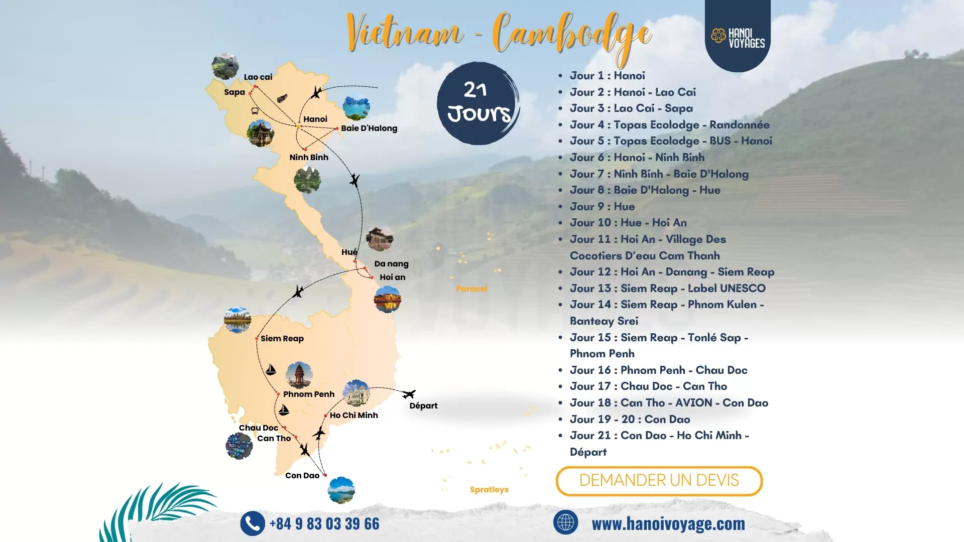 Voyage de 21 jours à travers le Vietnam et le Cambodge, immersion au cœur des paysages grandioses et des trésors culturels, découverte des sites emblématiques entre nature et histoire, exploration des rizières en terrasses et des temples majestueux, aventure authentique entre traditions et modernité.