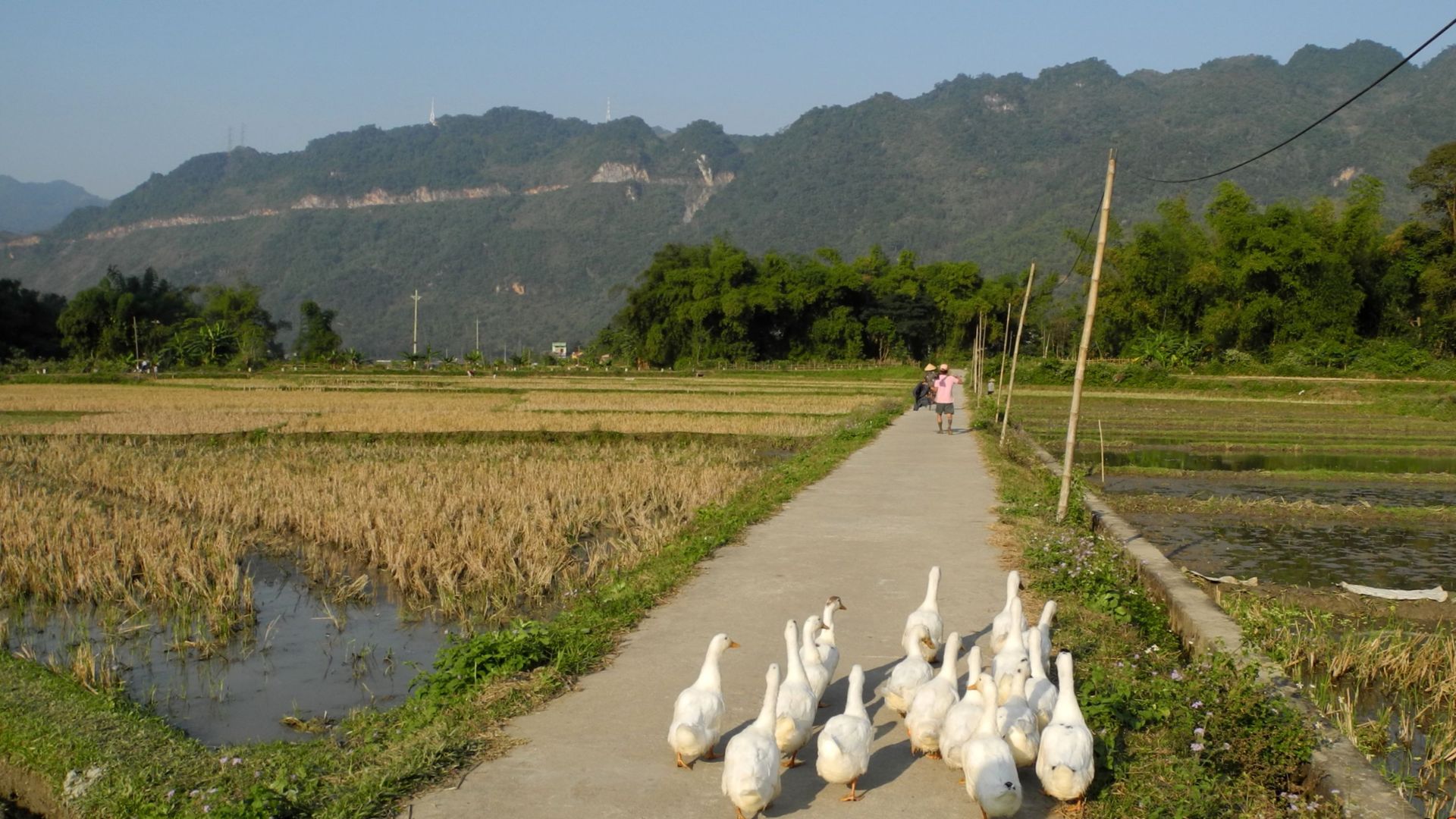Balade à vélo ou à pied : L’une des plus belles façons de découvrir Mai Chau est de prendre un vélo ou de marcher à travers les rizières. Le chemin serpente entre les champs, traverse des ponts en bambou, longe des petits ruisseaux et passe devant des buffles au repos.