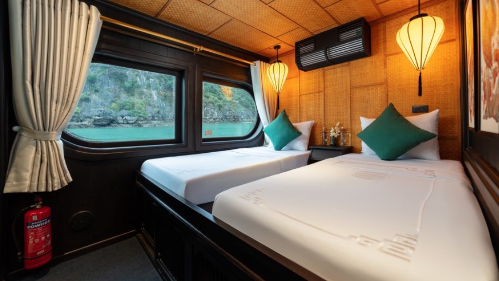 Naviguant sur les eaux émeraude et les paysages karstiques préservés de Bai Tu Long, Prince Junk offre une expérience de croisière intimiste et élégante. Les cabines en bois, chaleureuses et confortables, intègrent des matériaux naturels et des touches artisanales, offrant une ambiance authentique et panoramas spectaculaires sur la baie. Profitez de moments de détente sur le pont, savourez une cuisine raffinée locale ou explorez les lagons et villages de pêcheurs environnants.