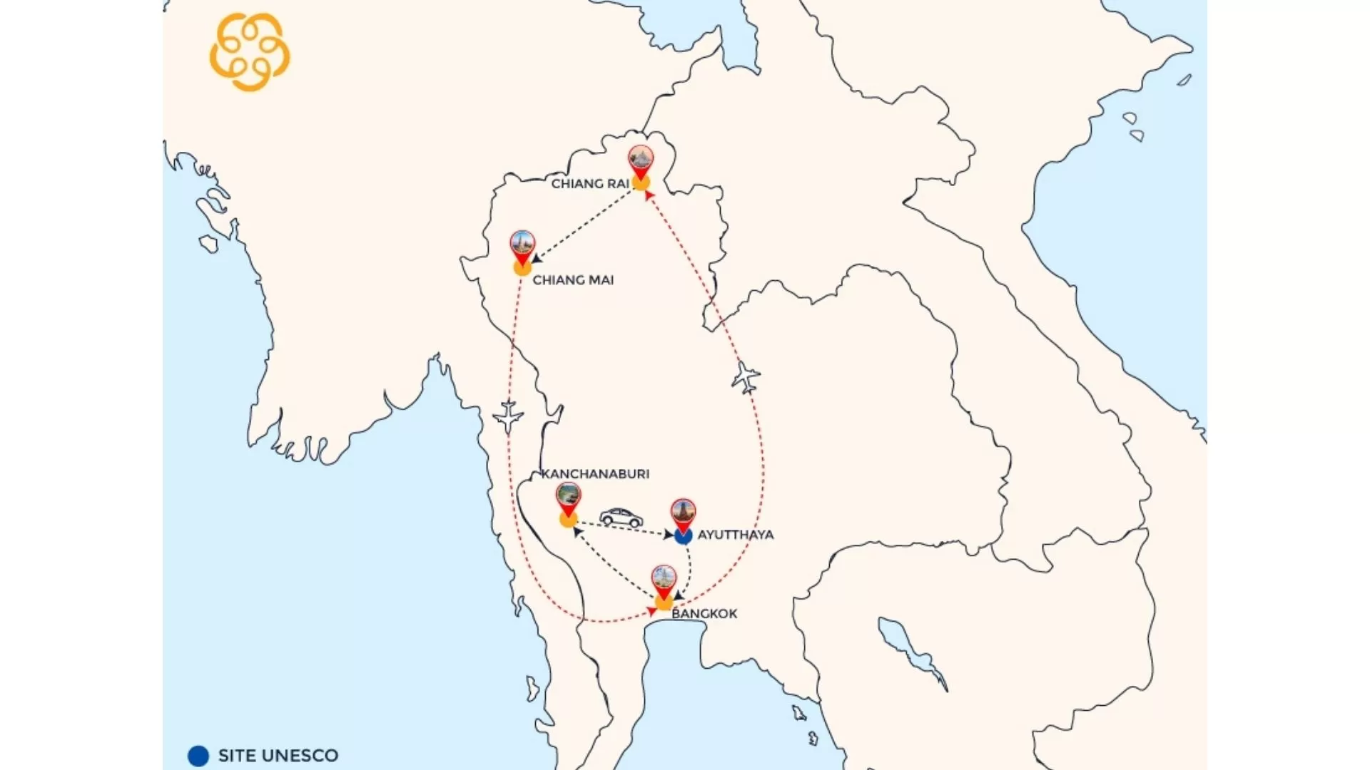 Day 1: Arrival at Bangkok Day 2: Bangkok - City tour Day 3: Bangkok - Maeklong Railway Market - Damnoen Saduak Floating Market - KANCHANABURI Day 4: Kanchanaburi - Ayutthaya Day 5: Ayutthaya - Bang Pa-In - Bangkok - Chiang Rai Day 6: Chiang Rai - City Tour - CRUISE on Mae Kok River Day 7: Chiang Rai - Golden Triangle - Chiang Saen - CHIANG MAI Day 8: Chiang Mai - City Tour - Wat Phrathat Doi Suthep Day 9: Chiang Mai – Doi Inthanon – NIGHT TRAIN – BANGKOK Day 10: Chiang Mai - Fly - Bangkok | ![]() |