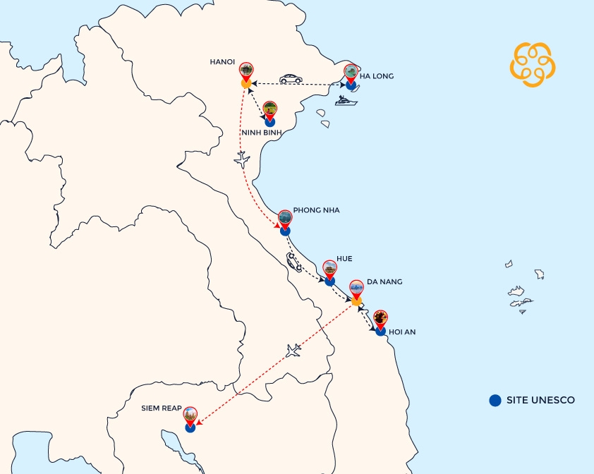 Place: Hanoi - Ninh Binh - Halong Bay - Phong Nha - Vinh Moc - Hue - Hoi An - My Son - Siem Reap
