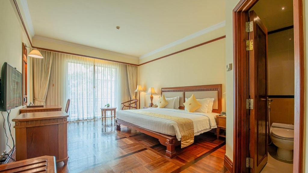 Sokha Angkor Resort vous accueille dans un cadre d’inspiration khmère, où chambres et suites mêlent élégance traditionnelle et confort moderne. Chaque espace est pensé pour offrir une atmosphère paisible, sublimée par des matériaux chaleureux et des touches artisanales locales. Certaines chambres s’ouvrent sur la piscine ou les jardins tropicaux, invitant à savourer pleinement la quiétude de Siem Reap.